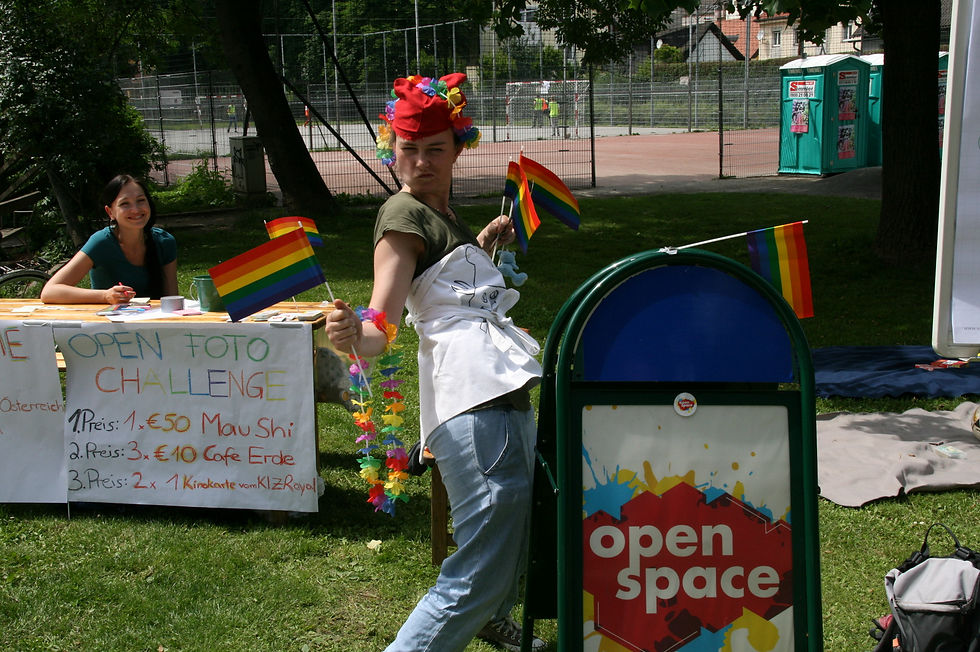 Am Samstag, 11. Juni 2016, fand das diesjährige CSD Parkfest der RosaLilaPantherInnen im Volksgarten statt. Wir wurden von den RosaLilaPantherInnen auch heuer wieder eingeladen und haben am Fest unseren OPEN SPACE Stand betreut. Unser diesjähriges Motto lautete "OPEN COME TOG(AY)ETHER" und hat das Zusammentreffen verschiedener Menschen gefördert. Wir haben einige Gesellschaftsspiele (UNO, Jenga, Activity, Kartenspiele, Würfelspiele, einen Fußball etc) bereitgestellt, die von den Parkfestbesucher*innen auf der Wiese gespielt werden konnten. Noch dazu - und das war das absolute Highlight - gab es eine "Foto-Challenge", bei der es tolle Preise zu gewinnen gab. Die Besucher*innen haben jeweils eine Aufgabe gezogen, die sie mit unseren zur Verfügung gestellten Utensilien nachahmen mussten: zum Beispiel die beste Rockstarpose zeigen, das Lieblingstier nachmachen, sich in den Chillmodus versetzen, die beste Grimasse schneiden etc. Zu gewinnen gab es zum einen, (*Trommelwirbel*) einen Gutschein vom Asian Fusion Restaurant "Mau Shi" im Wert von 50 Euro für den ersten Platz, weiters, (*Trommelwirbel*) als zweite Plätze 3 x je einen 10 € Gutschein vom Cafe Erde und als dritte Plätze (*Trommelwirbel*) 2 x je eine Freikarte für das KIZ Royal Kino! Wir möchten uns hiermit nochmals sehr herzlich bei den RosaLila PantherInnen für die Einladung und beim Asian Fusion Restaurant "Mau Shi", beim Cafe Erde sowie beim KIZ Royal Kino für das Zurverfügungstellen der großartigen Gutscheine für unser Gewinnspiel bedanken. Wir freuen uns auf nächstes Jahr und bedanken uns für euer Kommen! Euer Open Space Team